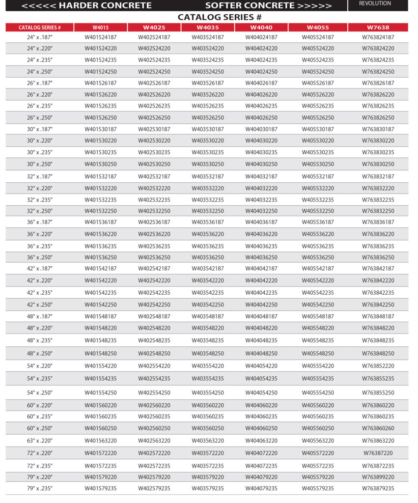 Product Spec Description W4015 Air saws, fast cutting 5 layer segments above 0.220” thick blades W4025 Fast cutting all purpose wall saw blade in most aggregates W4035 Hard limestone to granite aggregate improved life W4040 Hard aggregate with quartz and bazalt aggregate and heavy steel W4055 Hard flint and chert aggregate with steel, great life! W7638 Revolution fastest cutting blade